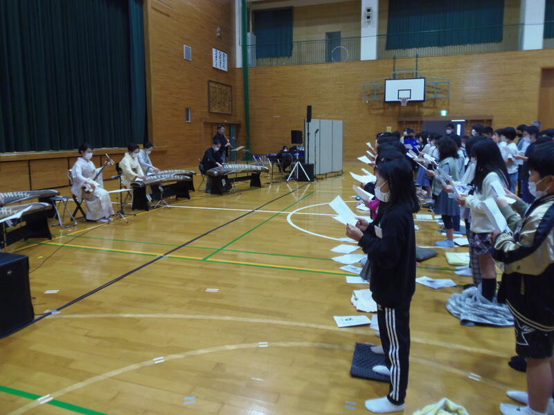 今日は、芸術鑑賞会があり、小学5年生から中学3年生までの児童・生徒が参加しました。今年度は、日本三曲協会のみなさんによる邦楽鑑賞会でした。日常生活の中であまり聴く機会のない箏、三絃、尺八などの和楽器の演奏を聴くことができ、とても貴重な時間となりました。中学2年生は、芸術鑑賞会に先立って、事前にワークショップを受けており、和楽器への親しみや理解がさらに深まったことでしょう。一流の演奏家の方々の素晴らしい演奏に酔いしれた2時間でした。