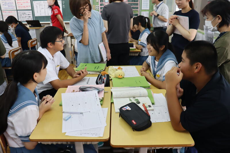 2年生は多くの先生に囲まれながらも積極的に対話し、意欲的に学習していました。