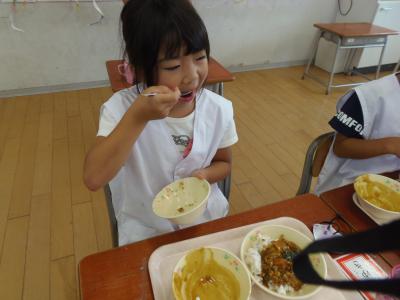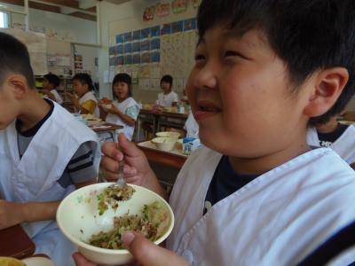 ↓ 今日は、小学1年生と4年生が、給食センターの見学に行きました。1年生は、「給食を残さず食べます」と約束してきたそうです。でも、カレーの中にはピーマンが・・・・。ゴーヤの料理もあります。