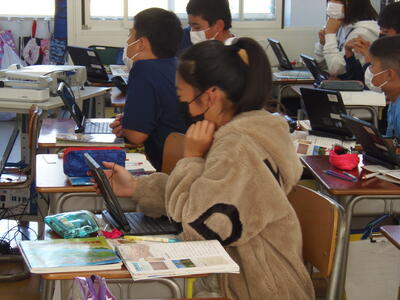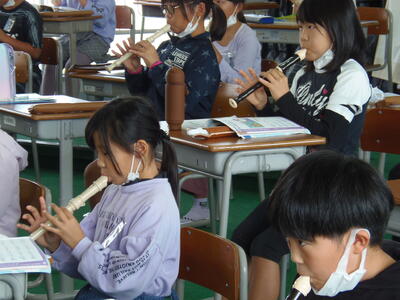 小学4年生は、音楽の授業でした。「陽気な船長」のリコーダーテストの日です。スタッカートの使い方を練習し、この後、一人づつテストを受けました。みんな真剣に取り組んでいました。