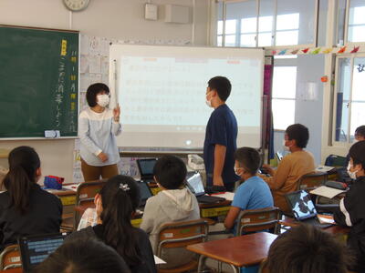 小学6年生は、社会の授業で織田信長と豊臣秀吉について学んだことを発表していました。子どもたちは、それぞれに分かれて、発表の後は、質問したり、それに答えたりと積極的に授業に取り組んでいました。