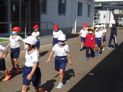 小学1年生が、体育の授業でグラウンドに移動する様子です。きちんと並んでから移動します。1年生にとっては、一つ一つのことが、勉強です。