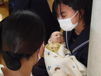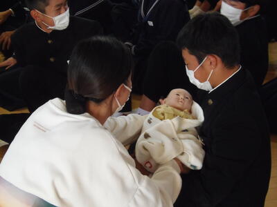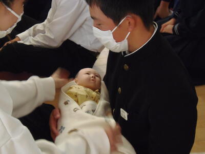 慈恵太郎くんを全ての生徒が抱っこしました。上手に抱っこができる生徒もいれば、恐る恐る抱っこしている生徒もいました。