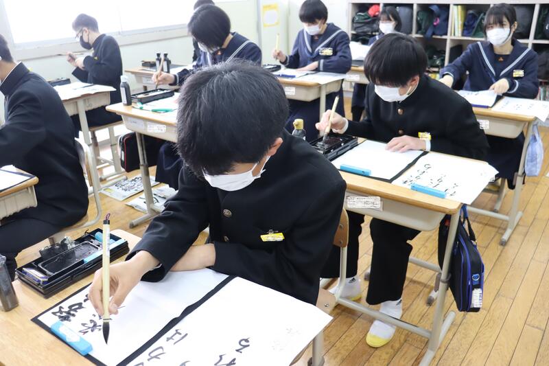 中学2年生も習字でした。立志式に向けて、座右の銘を色紙に書くので、その練習をしています。金曜日はきっと立派に発表してくれることでしょう。