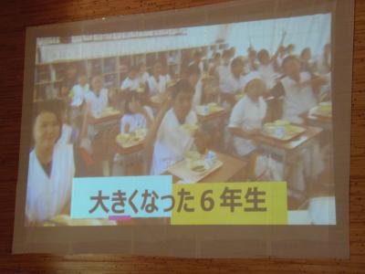 ↓ 次は、給食を食べている様子と感謝の言葉をビデオにとり、ビデオレターとして鑑賞しました。学級のカラーが出ていました。