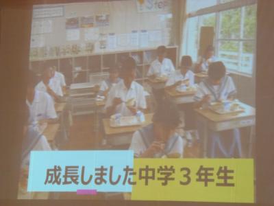 ↓ 次に中学3年生の代表が9年間の給食の思い出を発表してくれました。「様々な料理を食べられてよかった。給食のレバー料理は、食べやすい。ピーマンやゴーヤを食べられるようになった。」などの思い出を発表してくれました。