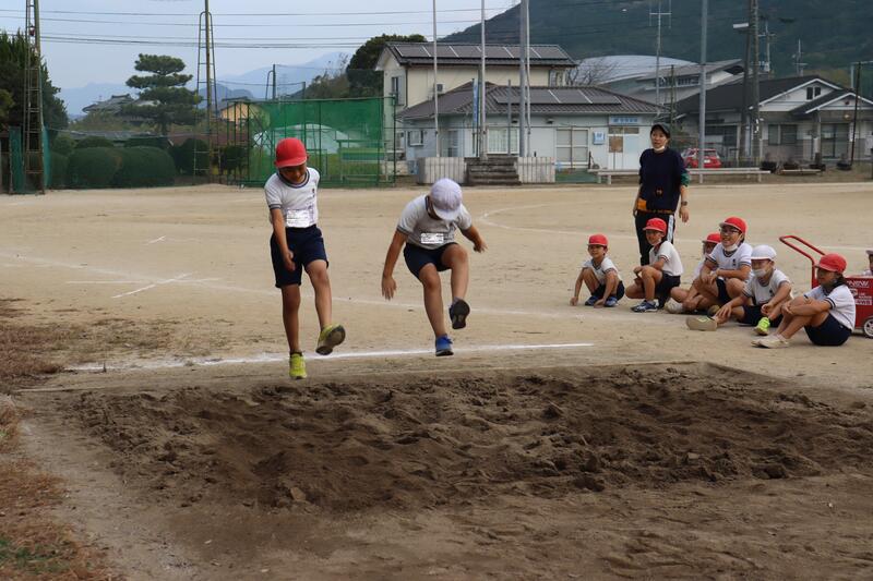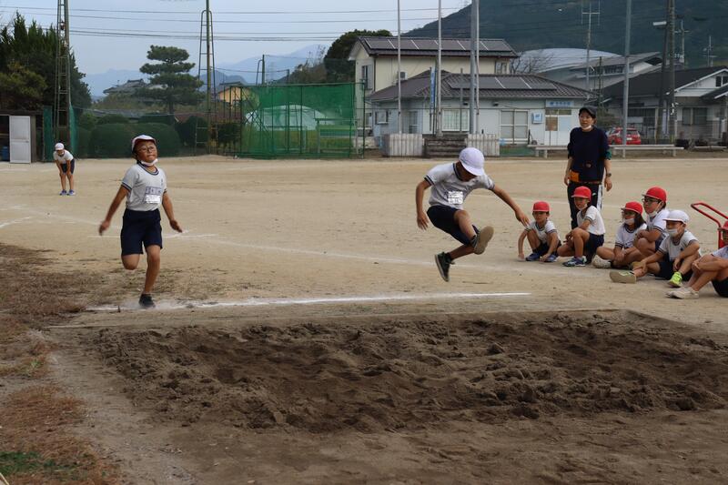 小学3年生は体育で走幅跳の学習をしていました。タイヤを置いて、跳び越えます!