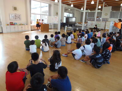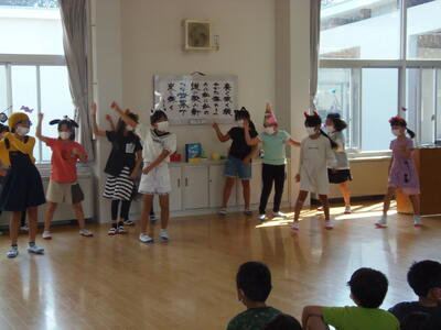 最初は、ダンス部によるダンスです。音楽に乗って気持ちよく踊っていました。参観している子どもたちも手拍子で盛り上げていました。