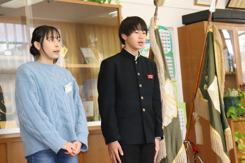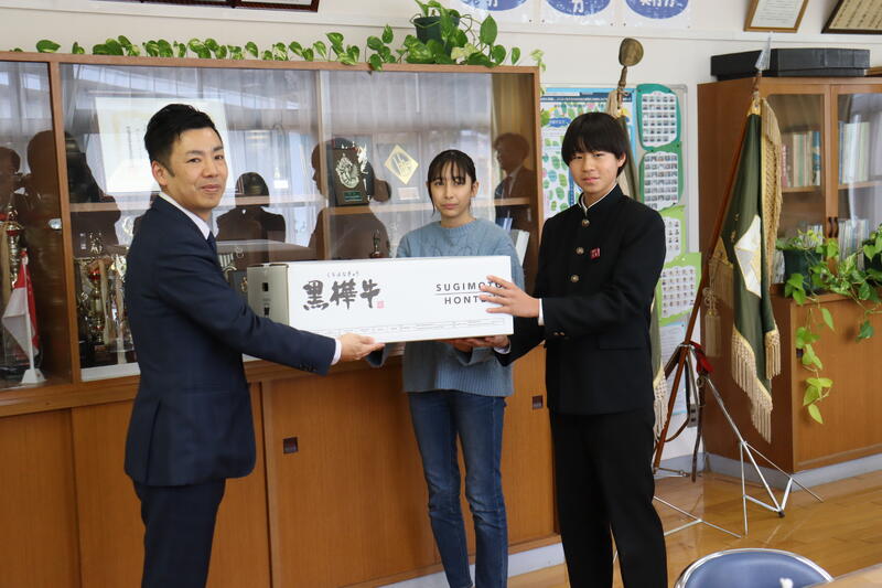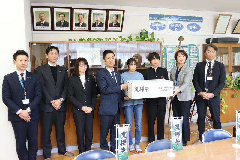 1月9日(木)の昼休みに本校の校長室で「学校給食への黒華牛無償提供に係る贈呈式」が行われました。