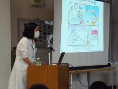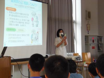 ↓ 講師の学校薬剤師、坂本先生から薬についていろいろと教えていただきました。