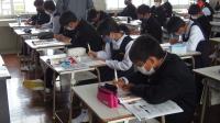 ↓ 中学2年生は、学力テストの英語のリスニングテストを受けています。