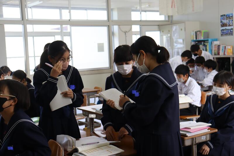 中学1年生は、国語で、調査結果をもとにしたレポートを作成していました。活発に意見交換していました。