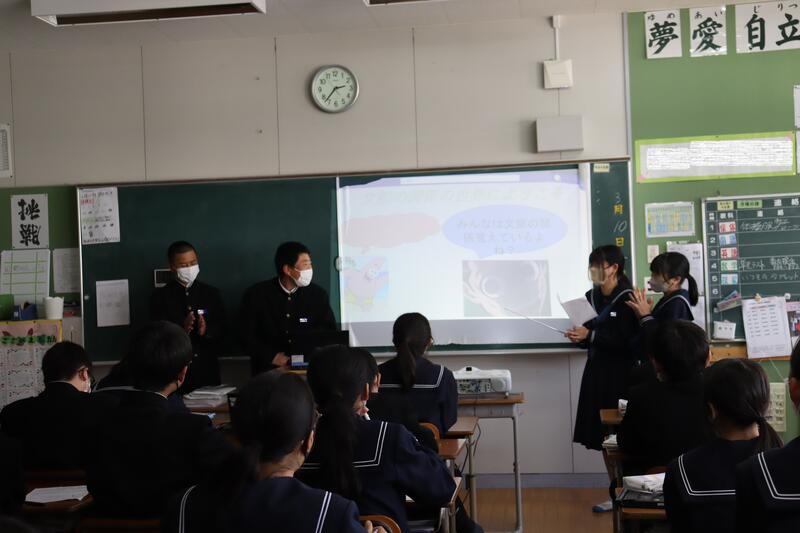 中学1年生は前回の続きで、一年間の国語のまとめを発表していました。どこの班も、クイズあり、ひねりありの工夫の見られる発表でした。
