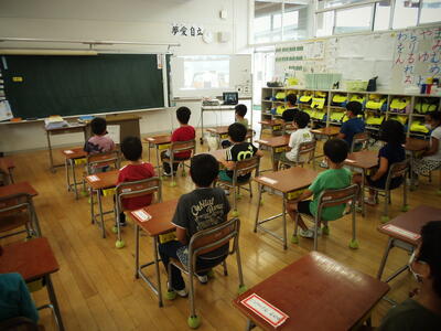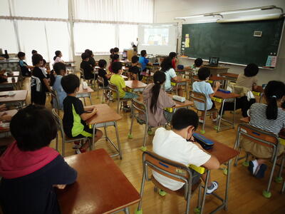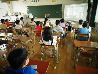 教室で廣瀬校長先生の話を聞く小学1年生から6年生の児童たち。