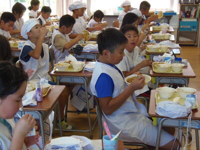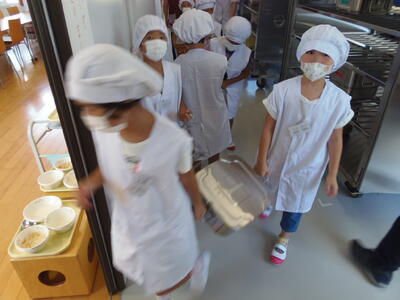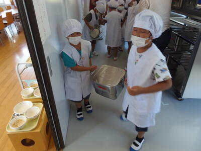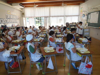 準備が整って、久しぶりの給食をいただきます。(小学4年生)