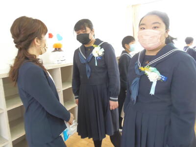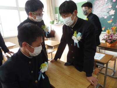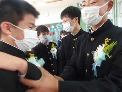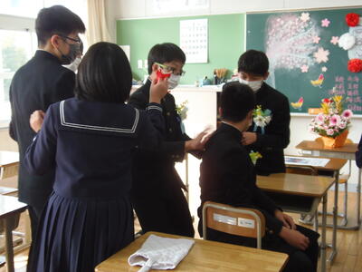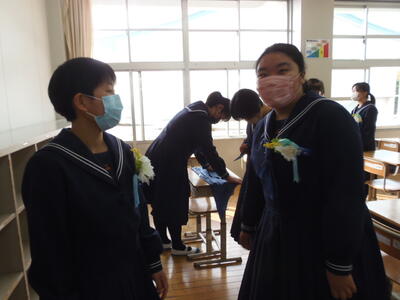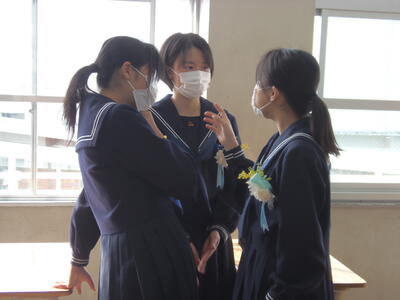 お互いにコサージュをつけ合い、笑顔に満ち溢れていました。