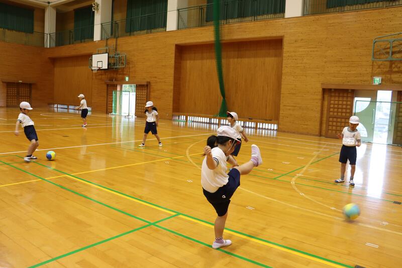 小学1年生は体育で、ボール遊びをしていました。上手に蹴っています!