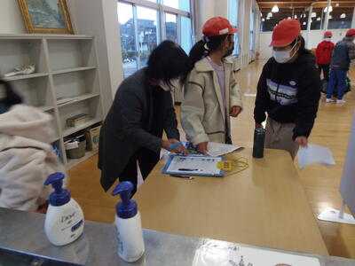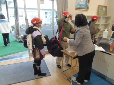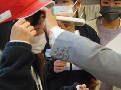 今日は、小学6年生の修学旅行の日です。今日から1泊2日で長崎方面へ出かけます。出発前の体温チェックの様子です。