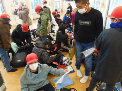荷物の最終確認を行っています。忘れ物もないようにみんなでチェックしています。
