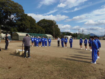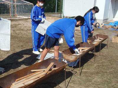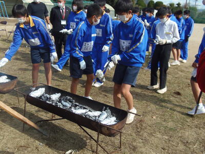 中学1年生が、焼き芋体験の準備をしています。