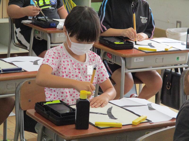 今日は、小学3年生は書写で毛筆の学習をしました。地域の習字の先生がゲストティーチャーで来てくださるので、とてもありがたいです。みんな毎回、「もっと書きたい!」と、意欲満々です。今日は「人」という字を書きました。右払いに苦労したようですが、みるみる上手になっていきました。