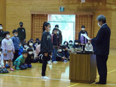 集会の前には、持久走大会、読書感想文、手洗いポスターコンクールなどの表彰を行いました。