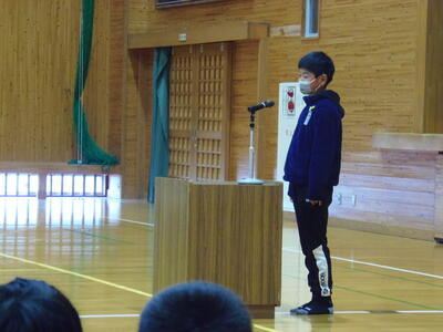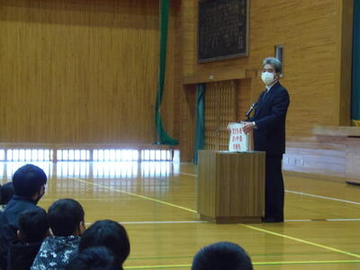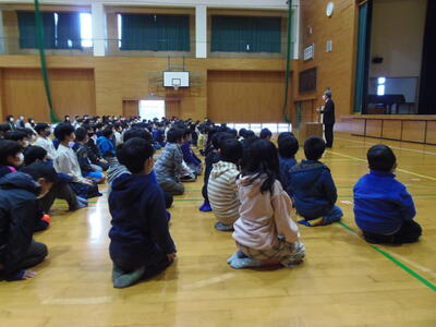 終業集会では、校長先生や2・4・6年生の代表発表が行われ、後期前半の振り返りと冬休みの過ごし方についての話がありました。