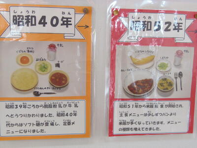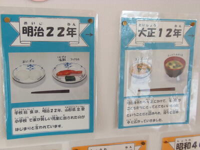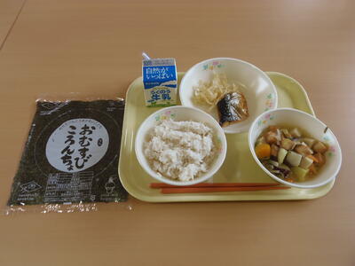 今週は、全国学校給食週間です。1日目の目乳は、明治22年の献立を再現し、セルフおにぎり、栄養みそ汁、塩サバ、たくあん、牛乳でした。