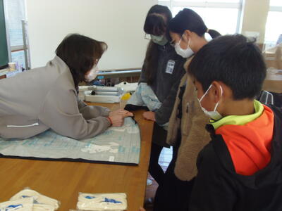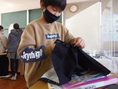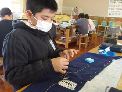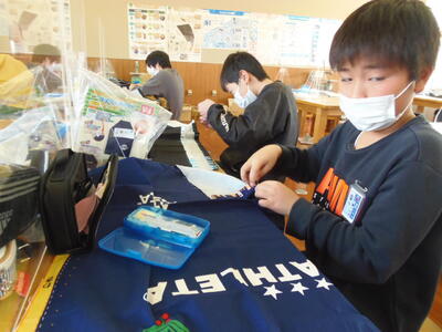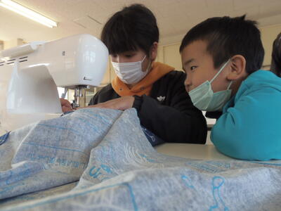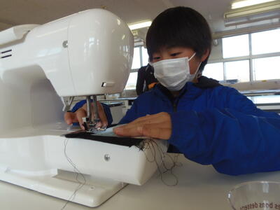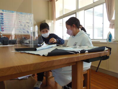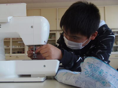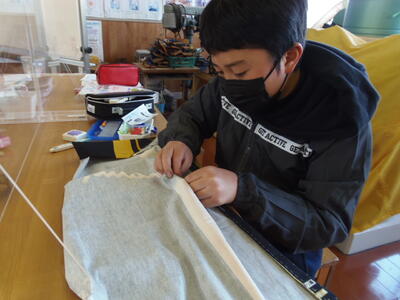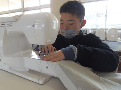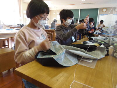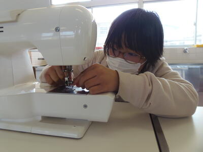 小学5年生は、家庭科の授業でエプロンづくりに挑戦していました。みんな手先が器用で集中して作っていました。