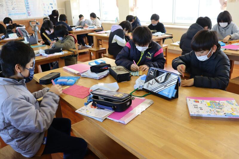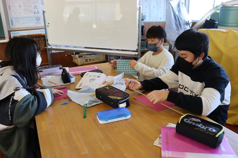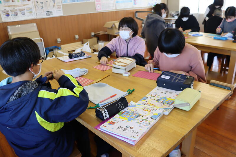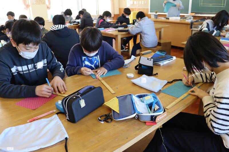 小学6年生は、家庭科で布を使った小物づくりに取り組んでいました。慎重に寸法をはかっています。どうやら、ポケットティッシュのケースを作るようです。