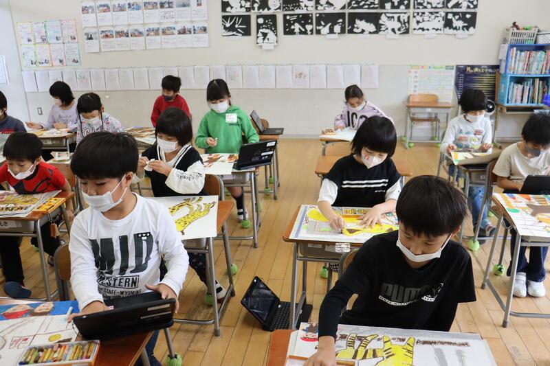 小学2年生も図工で絵を描いていました。こちらは動物園に行った時の絵です。動物を大きくのびのびと描いていて、動物園での感動が伝わってきますね。出来上がりが楽しみです。