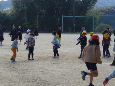 小学1年生と中学1年生が「ハンターごっこ」をして一緒に遊んでいました。