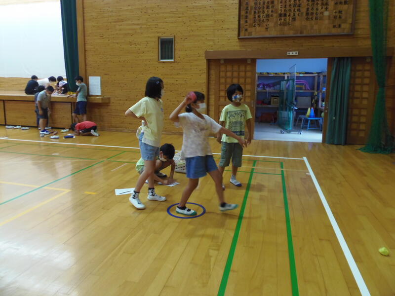 スリッパとばし。遠くまでとばすのはなかなか難しい!がんばれ!