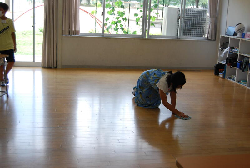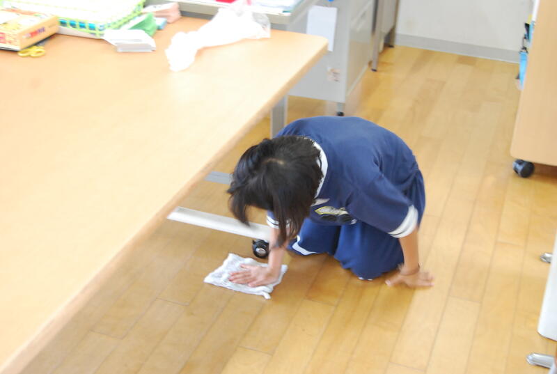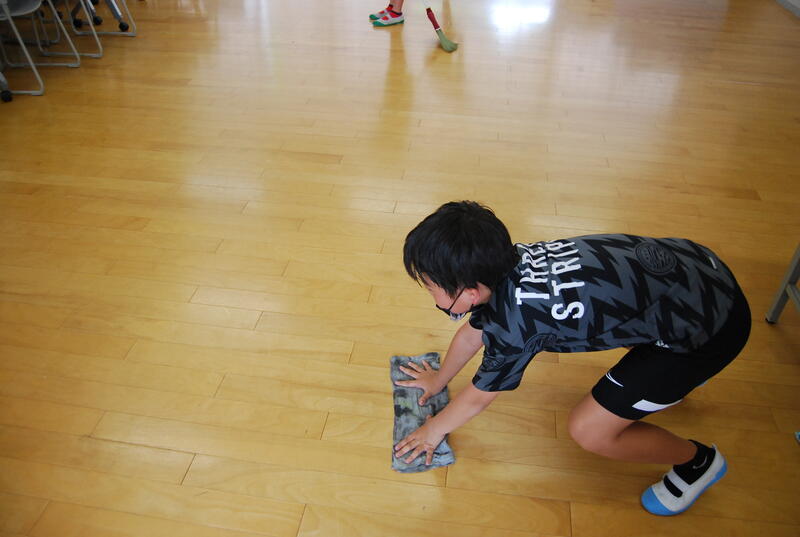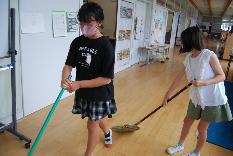 楽しんだあとは掃除をがんばる豊野っ子。もくもくとがんばります。