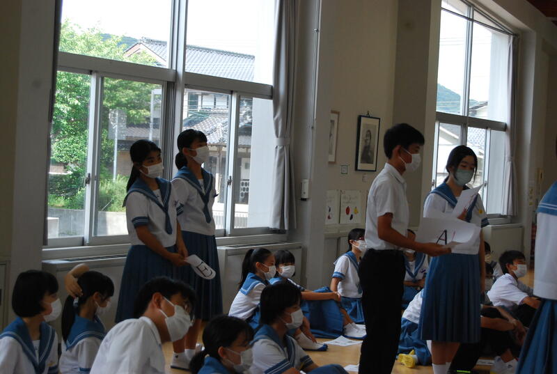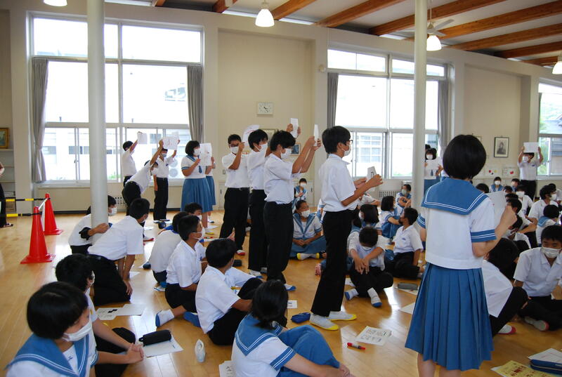 中学生は、午後から「ジュニア食品安全ゼミナール」でした。熊本県くらしの安全推進課から、お二人の講師の方をお招きして、お話を聞きました。