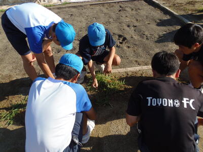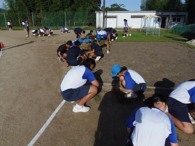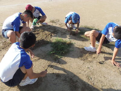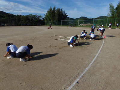 ↓ 朝から体力づくりに取り組んでいる中学生は、前半の最終日としてグラウンド整備を行いました。普段使わせていただいているグラウンドに感謝の気持ちを持って頑張りました。