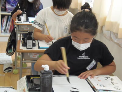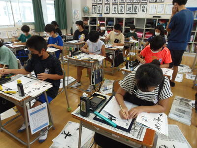 5年生は、習字の授業でした。「きずな」という文字を書いていました。教室に人がいないのかと思うほど、静かでに集中して書いていました。