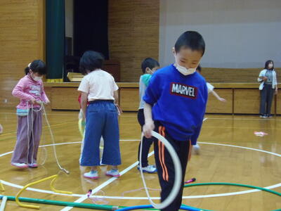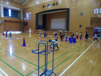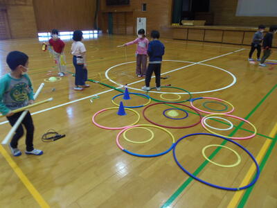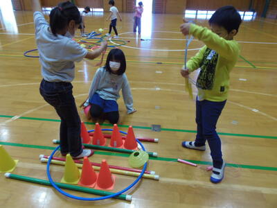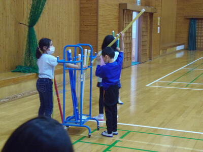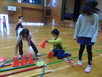 小学1年生は、図工の時間で、体育館の道具を使い、班でいろいろなものを作成しました。