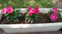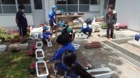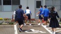 ↓ 環境委員会の生徒たちが、プランターに花の苗を植えました。中原先生が、「苗は、バランスよく植えてください」と伝えた後、植え始めました。