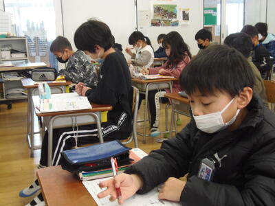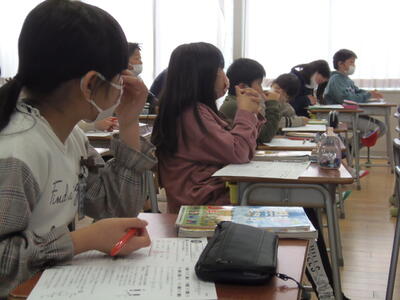 問題を解いて、その答え合わせをしていました。みんな結構、丸が多かったです。間違ったところもちゃんと見直しをしていました。