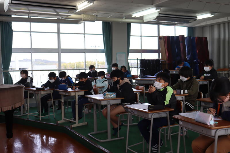 小学4年生は音楽のペーパーテストをがんばっていました。聴くテストに耳を傾けています。