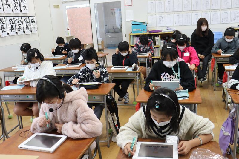 小学2年生は、国語「お手紙」の授業です。並行読書で、アーノルドローベルのお話の中から一つ選び、紹介文を書いています。並行読書もタブレットPCを使って行いました。