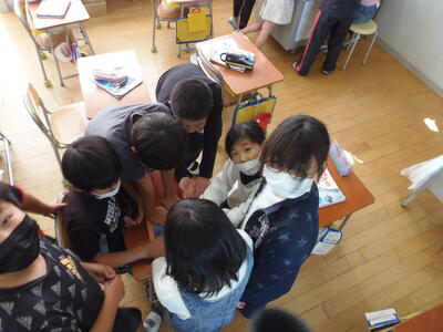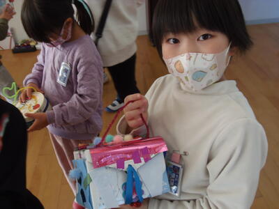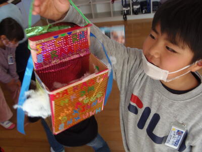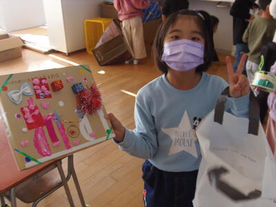 1年生の教室に行くと、自分たちで作った作品を「見て、見て」とみんな寄ってきました。どの作品もそれぞれくふうしてあり、上手にできていました。