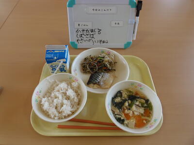 今日の給食は、牛乳、麦ごはん、かきたま汁、塩サバ、野菜の磯和えでした。かきたま汁が優しい味でした。