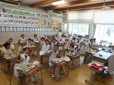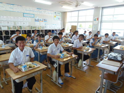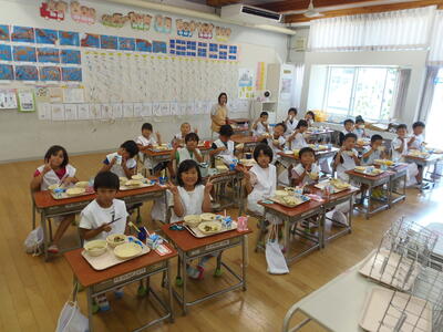 ↓ 豊野給食センターで作る最後の給食をいただいている様子を紹介します。