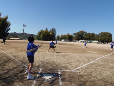 青空の下、中学2年生が、昼休みにソフトボールのクラスマッチでクラスの親睦を図りました。