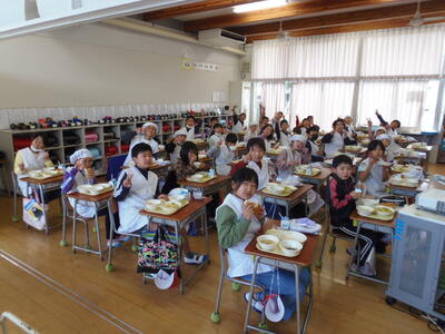 給食の様子をお伝えします。(学級によっては、全員が写真に納まりませんでした。すいませんでした。)