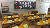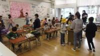 新小学1年生の教室では、6年生が朝の準備のお手伝いをしています。