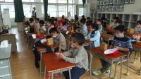↓ 中学2年生は、学力テストの英語のリスニングテストを受けています。