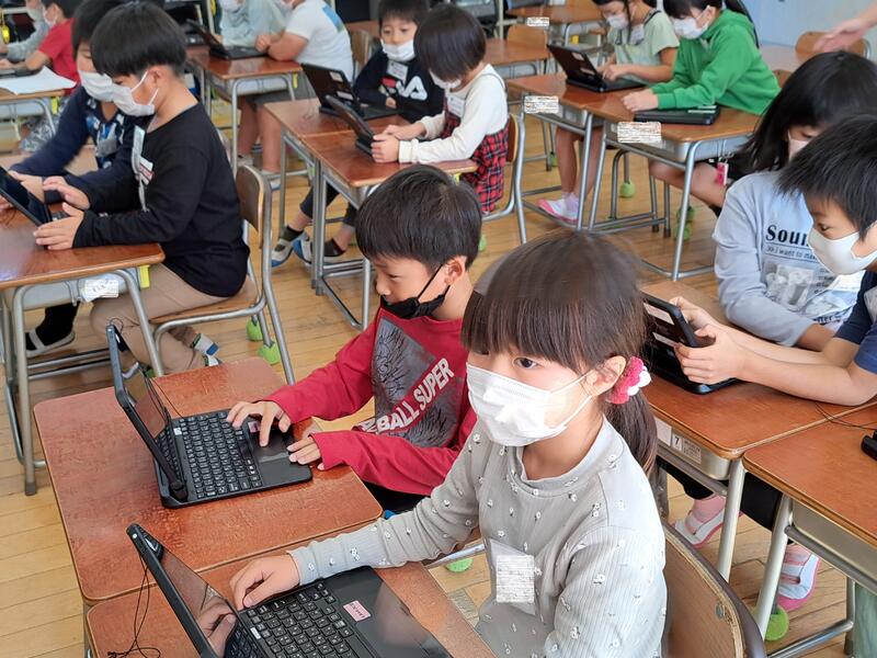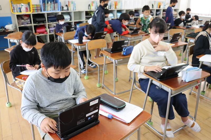 小学4年生はタブレットPCを使って何やら調べ物をしていました。タブレットPCをよく使いこなしています。
